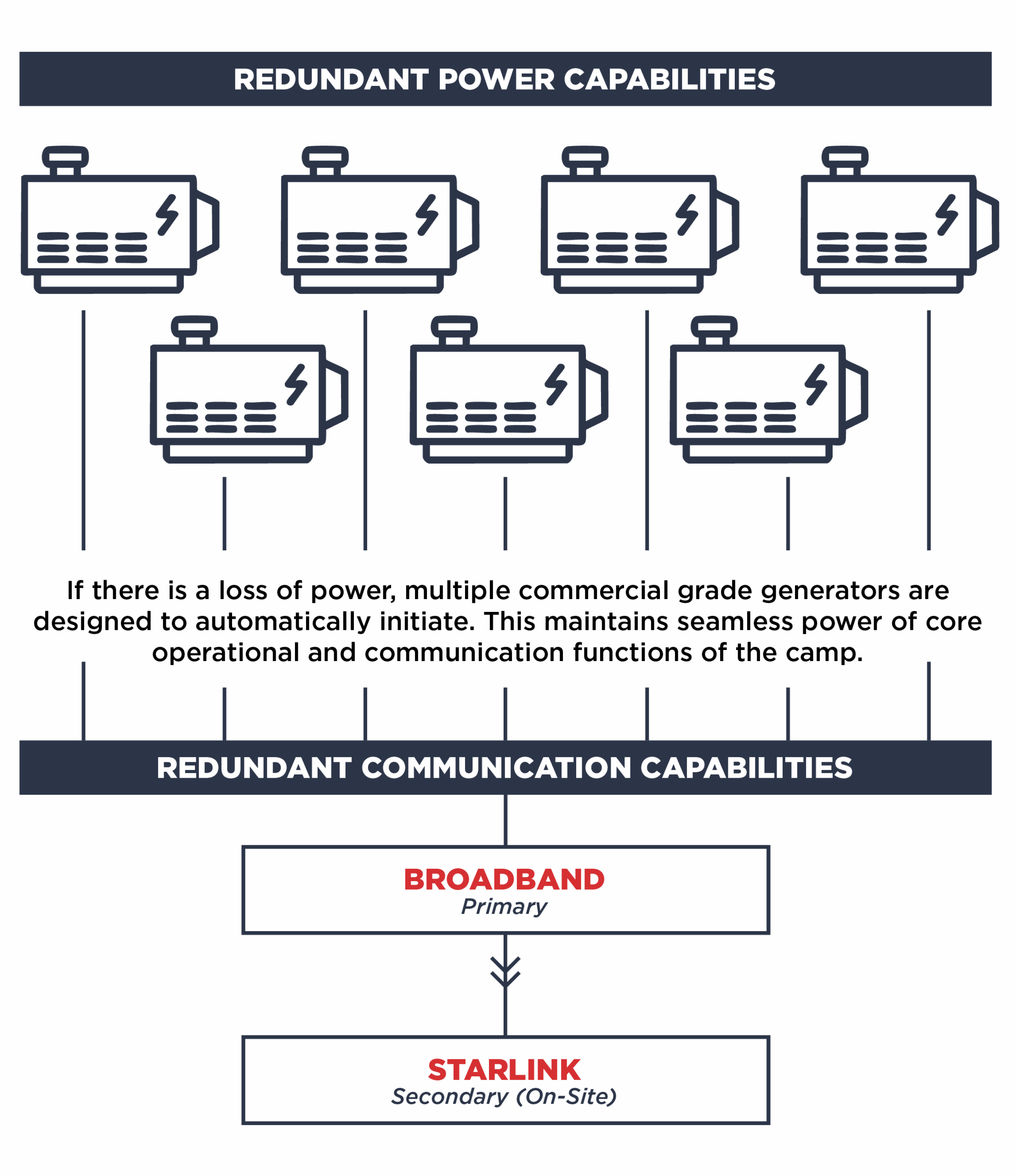 Camp Ozark’s backup power and communication systems use a multi-layered approach to prioritize independence and reliability while remaining operational and connected under a variety of scenarios.